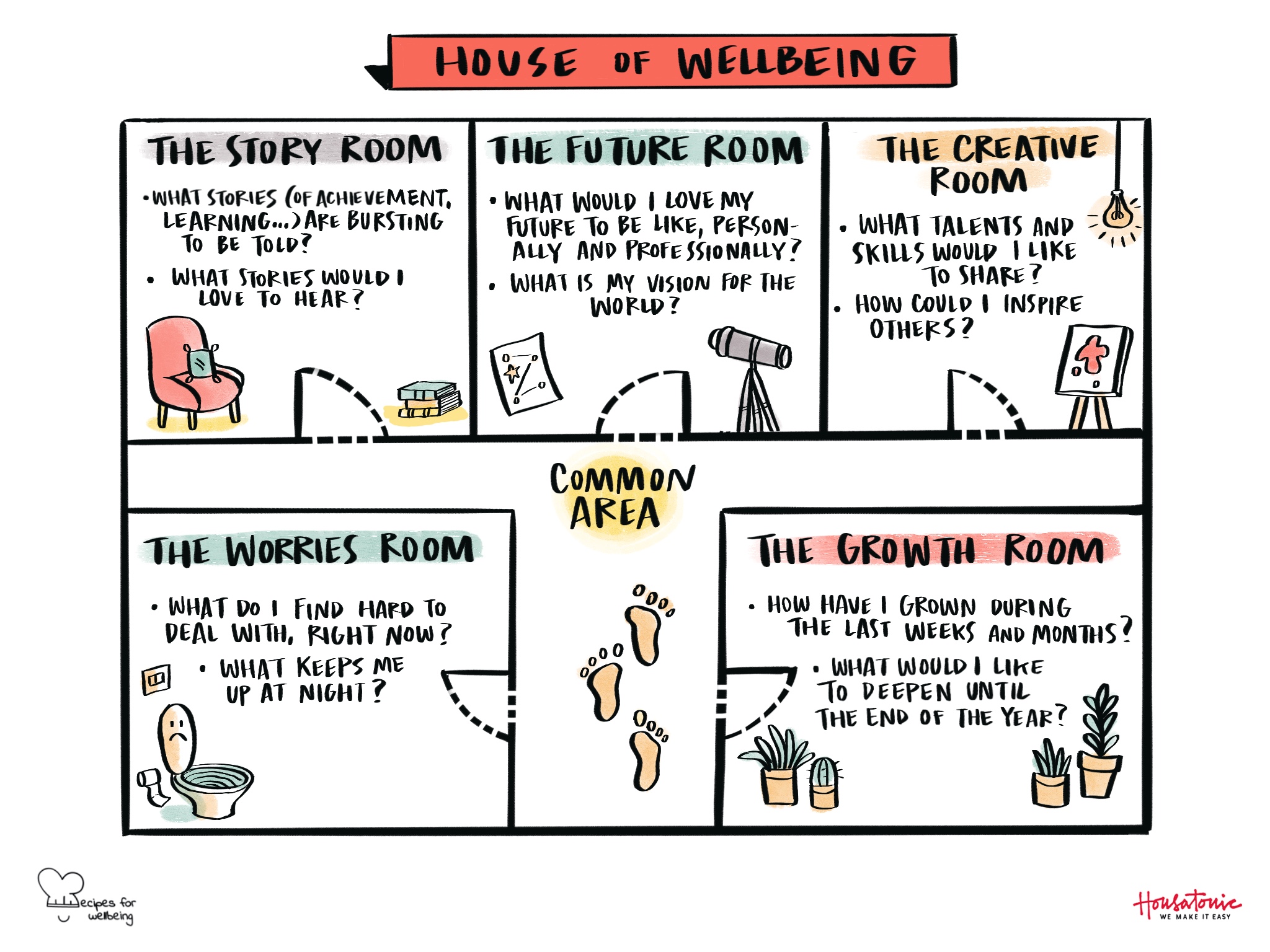 Illustration of a house with 6 thematic rooms: the story room, the future room, the creative room, the worries room, the growth room, and common area. © Recipes for Wellbeing